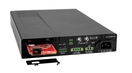 Die optionale Steckkarte Atlona GAIN-NET macht den Verstärker AES76 und Dante kompatibel.