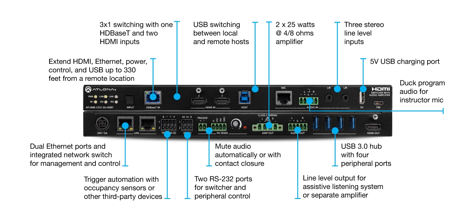 Das Atlona AT-OME-CS31-SA-HDBT ist ein AV-Präsentations- und Kollaborationssystem der Omega™-Serie mit AV-Switching, USB-Routing, Audiomischung, Verstärkung und Steuerung, das sich ideal für moderne Klassenzimmer und Konferenzräume eignet.