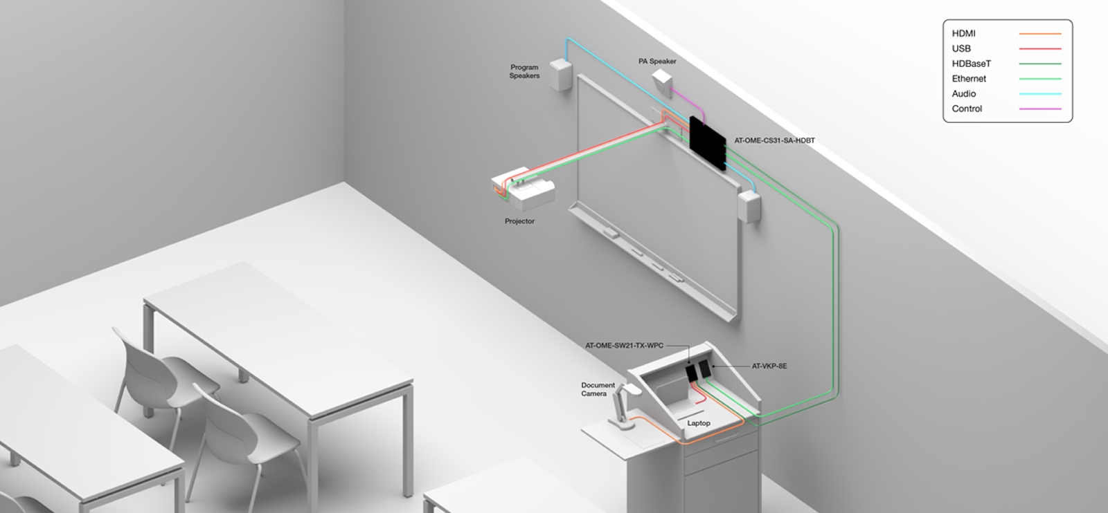 Der OME-CS31-SA-HDBT verfügt außerdem über Audio-Integrationsfunktionen für Klassenzimmer, die sicherstellen, dass Unterrichtsmaterial und Durchsagen deutlich zu hören sind: