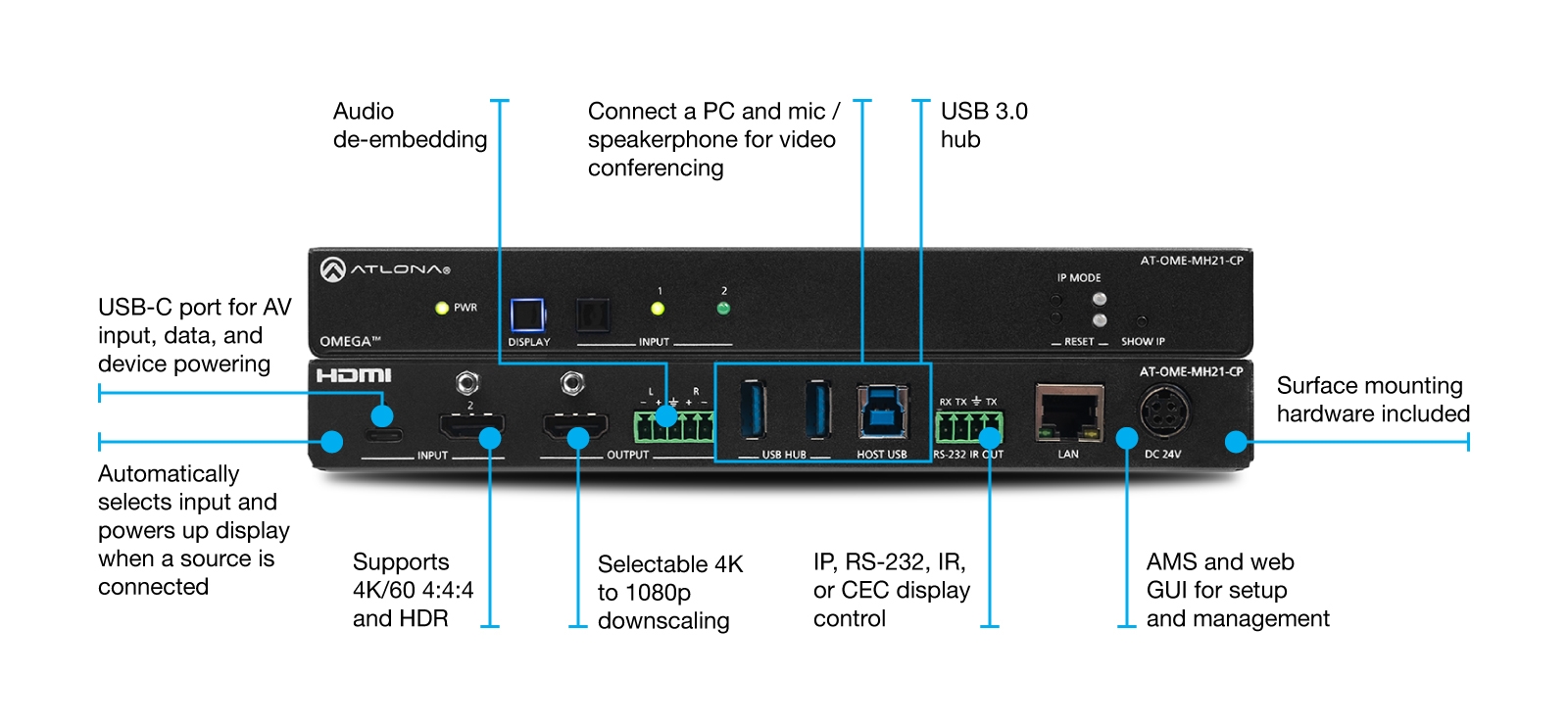 Der OME-MH21-CP verfügt über automatische Eingangsumschaltung, Display-Steuerung, Audio-De-Embedding und einen USB 3.0-Hub für Videokonferenz-Peripheriegeräte oder Touch-Displays. Der OME-MH21-CP ist HDCP 2.2-kompatibel und unterstützt 4K HDR und 4K/60 4:4:4 bei HDMI-Datenraten von bis zu 18 Gbps. Zusätzlich können UHD/4K Signale auf 1080p runterskaliert werden.