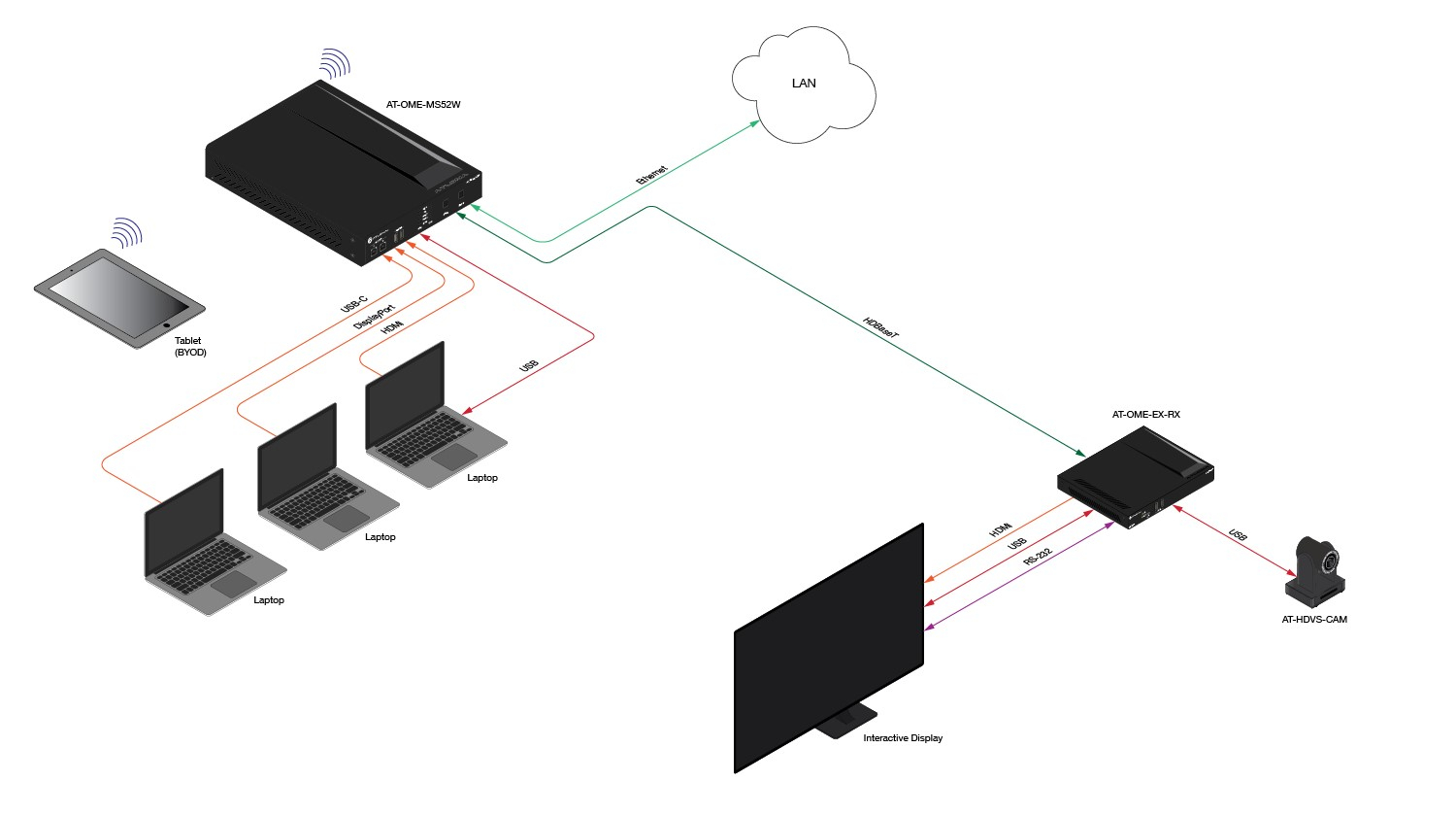 Der MS52W ist ein digitaler Multiformat-Umschalter mit integriertem WiFi-Modul zur Integration von iOS, Android, Chromebook und Miracast. Der MS52W ist konsequent für die Nutzung von digitalen Präsentationsgeräten ausgelegt und bietet neben zwei HDMI- und einem Displayport-Eingang zusätzlich einen USB-C-Anschluss. Ausgangsseitig steht ein HDMI und ein HDBaseT-Port zur Verfügung (gespiegelt oder matrix-Modus). Zusätzlich zu den AV Eingängen kann das Gerät auch USB 2.0 Geräte verwalten und per HDBaseT an entfernte Empfänger senden (maximal 120 Mbit/s).