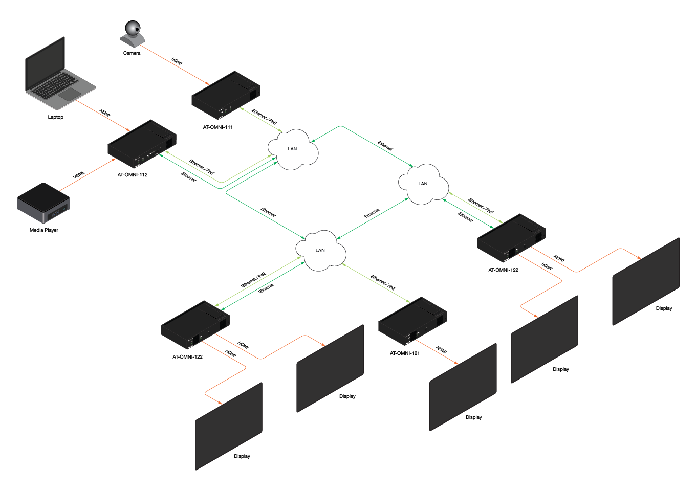 Der Encoder übertragt zwei UHD/4K oder bis zu vier Full-HD Streams (Redundanz) über ein Standard 1-Gigabit Netzwerk. Die Encoder und Decoder werden über das Atlona Management System (AMS) konfiguriert und gesteuert, insbesondere das Routing der Ein- und Ausgänge (Virtual Matrix) ist dank des grafischen Interfaces einfach zu steuern.