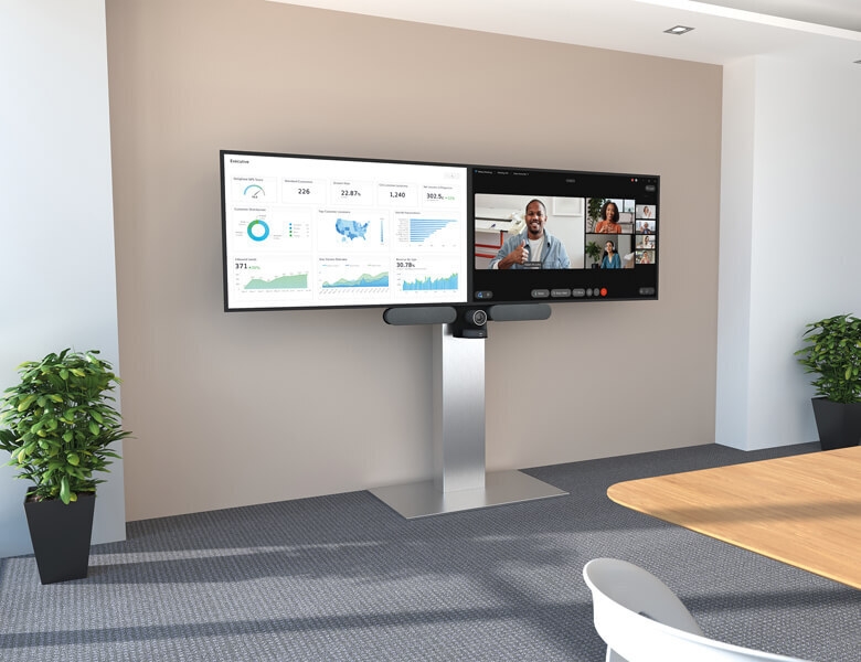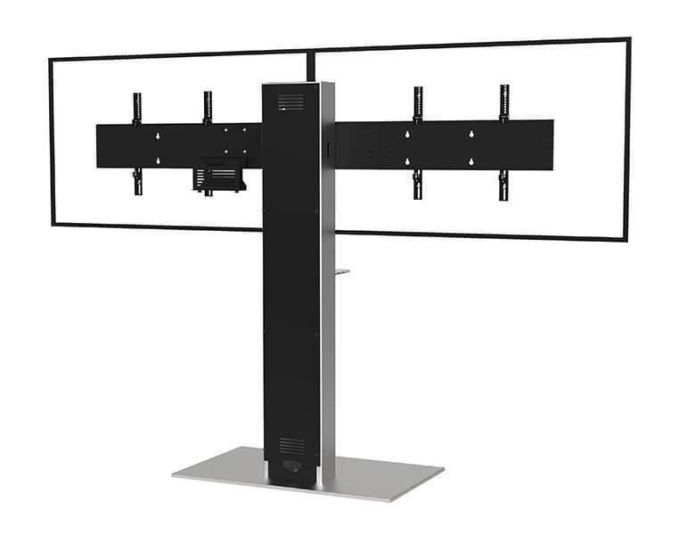 Der XENON Dual Screen von Axeos ist eine Standhalterung für zwei Displays zwischen 70 und 90 mit einer Gewichtskapazität von 60 kg pro Bildschirm.