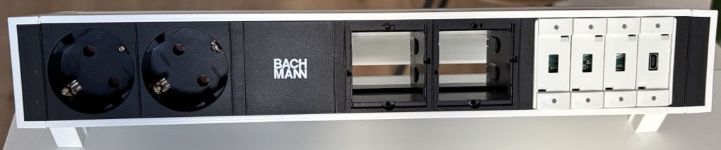 Das Set besteht aus einem Bachmann DESK2 (weiß) mit 2x Schuko-Steckdose, 2x Leermodul (CM) und einem Biamp Impera Echo Plus (DK). Die Biamp Tastensteuerung wird im Werk vormontiert. Die beiden Leermodule müssen nach Kundenwunsch bestückt werden (z.B. HDMI, CAT oder USB-C).