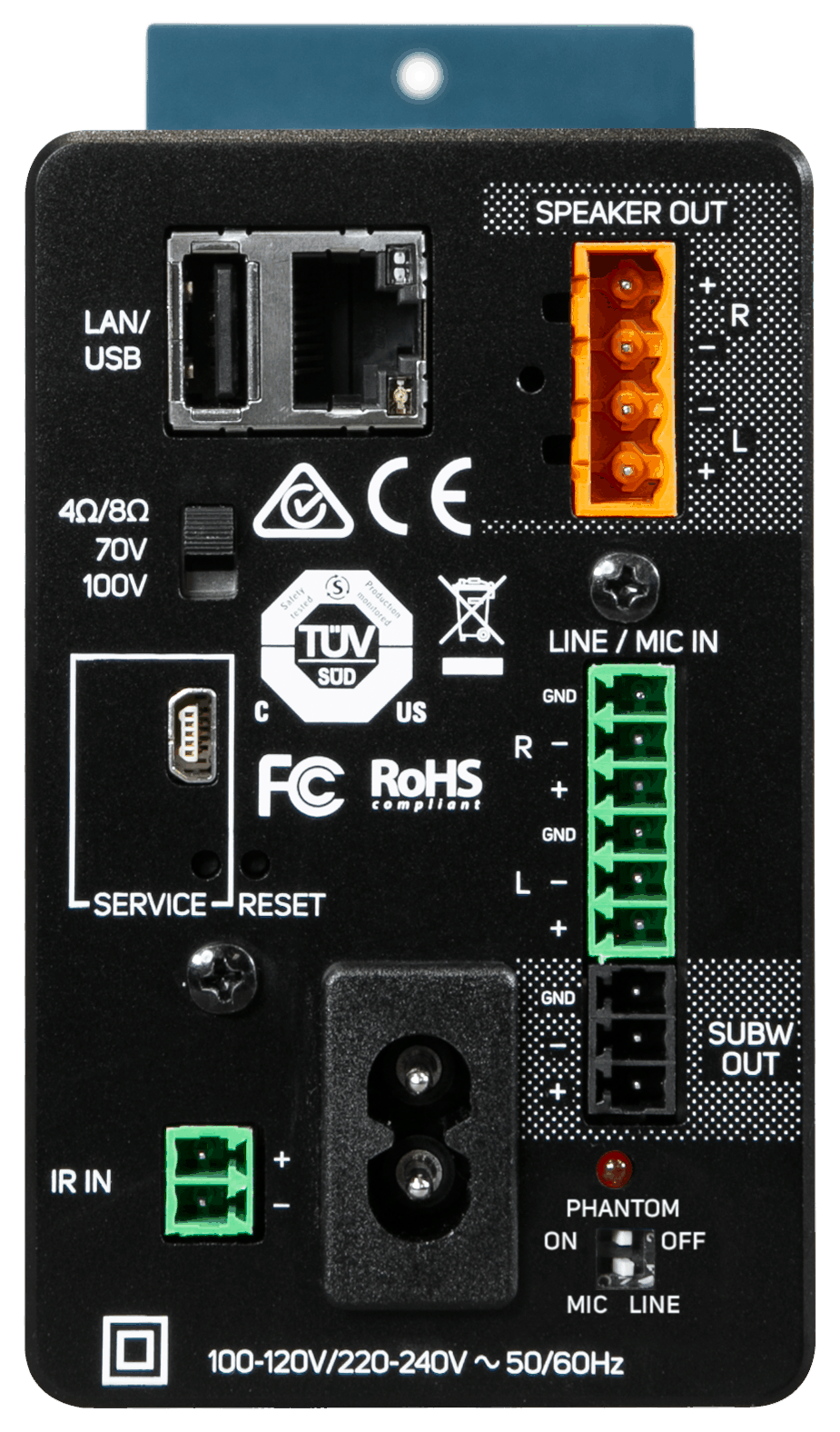 Der Bluesound Professional B170S ist ein vielseitiger netzwerkfähiger Streaming-Stereo-Verstärker für professionelle Musikinstallationen. Er kombiniert einen leistungsstarken Verstärker mit einem BluOS-basierten Musikplayer und liefert 2 x 80 W an 4/8 Ohm oder 2 x 100 W an 70 V bzw. 1 x 100 W an 100 V. Damit eignet sich der B170S ideal für kleine bis mittelgroße Räume. Die effiziente Verstärkertechnik mit thermostatisch geregelter Lüftung sorgt für zuverlässigen Betrieb und einen sparsamen Standby-Modus mit nur 6 W Verbrauch.