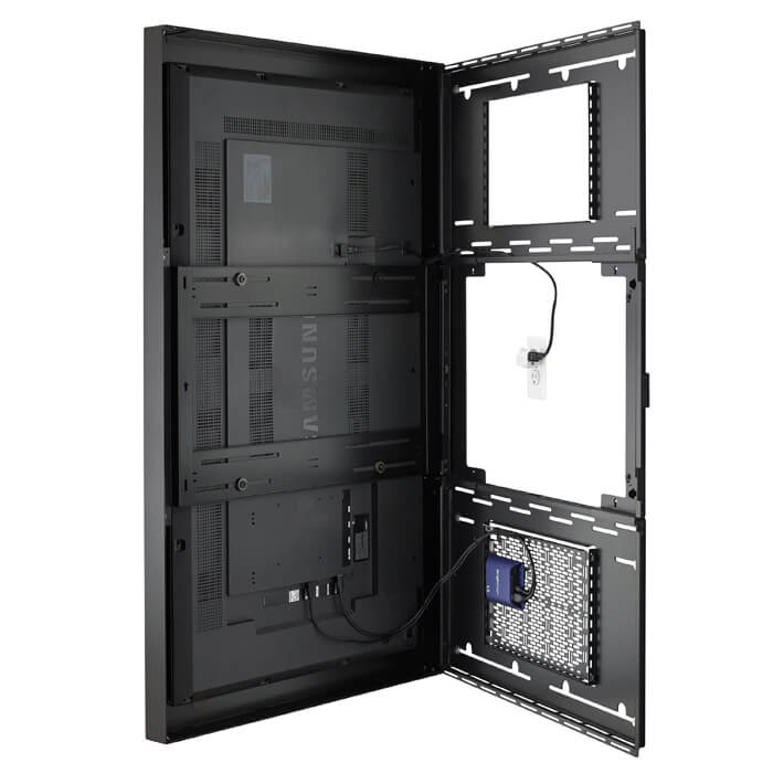 Der Impact ™ On-Wall Kiosk bringt neue Möglichkeiten auf dem Markt für Digital Signage-Gehäuse und sorgt gleichzeitig für ein elegantes Aussehen. Ein tiefenverstellbarer Außenrahmen ermöglicht die Verwendung einer Vielzahl von Displays. Dank der umkehrbaren Scharniere werden Installations- und Wartungsschwierigkeiten vermieden. Zudem bleibt das Display beim Öffnen im Rahmen montiert, was die Wartungszeit verringert.