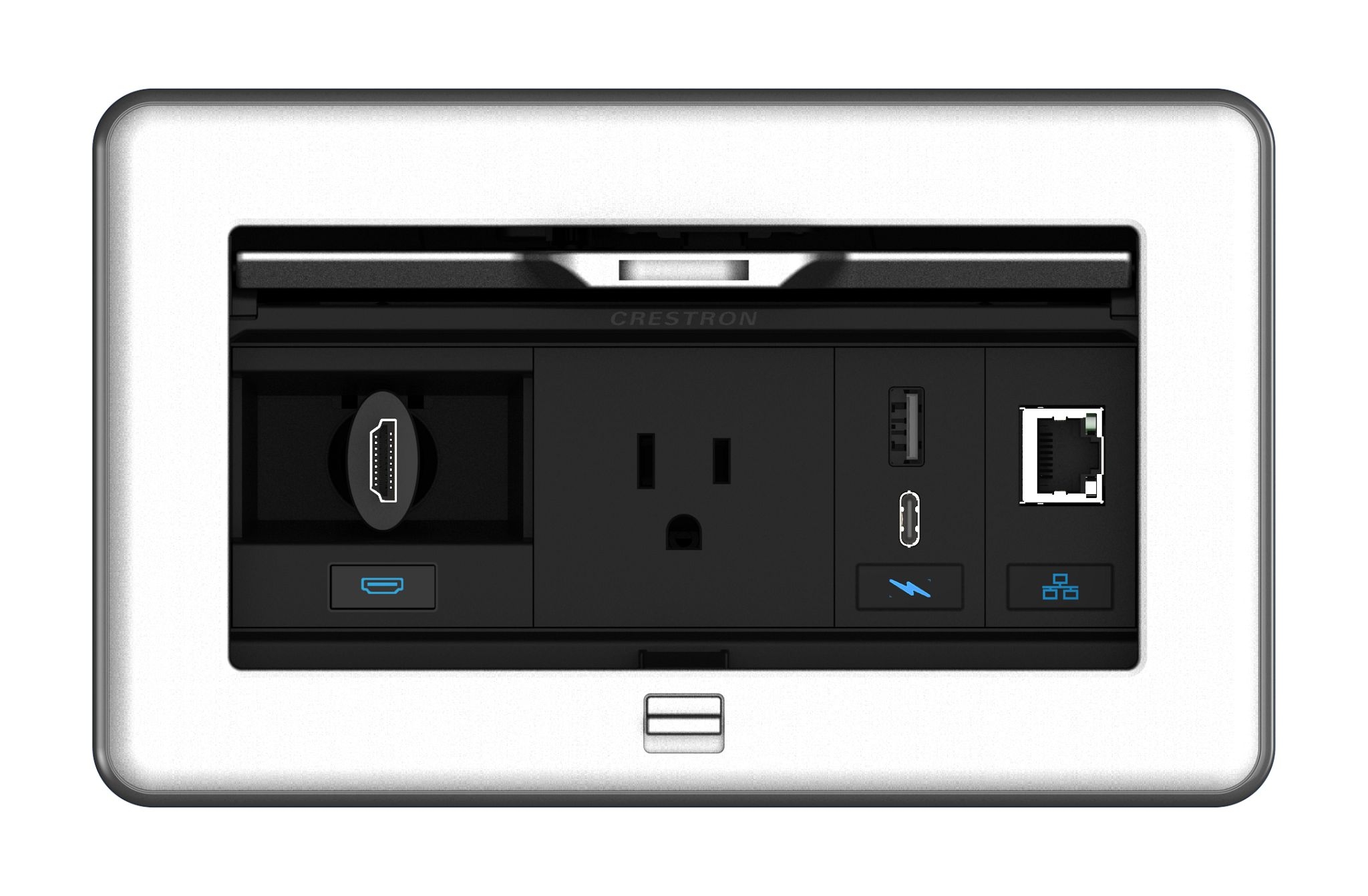 - Hintergrundbeleuchtete Symbolsymbole auf bestimmten Crestron FT2-Zubehörteilen, wie aktiven Anschlussplatten oder USB-Schnellladegeräten (separat erhältlich), leuchten auf und ermöglichen eine klare Identifizierung in einem abgedunkelten Raum