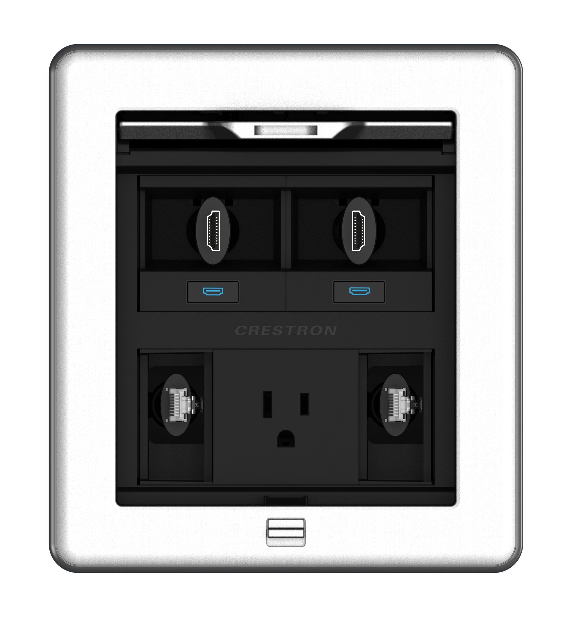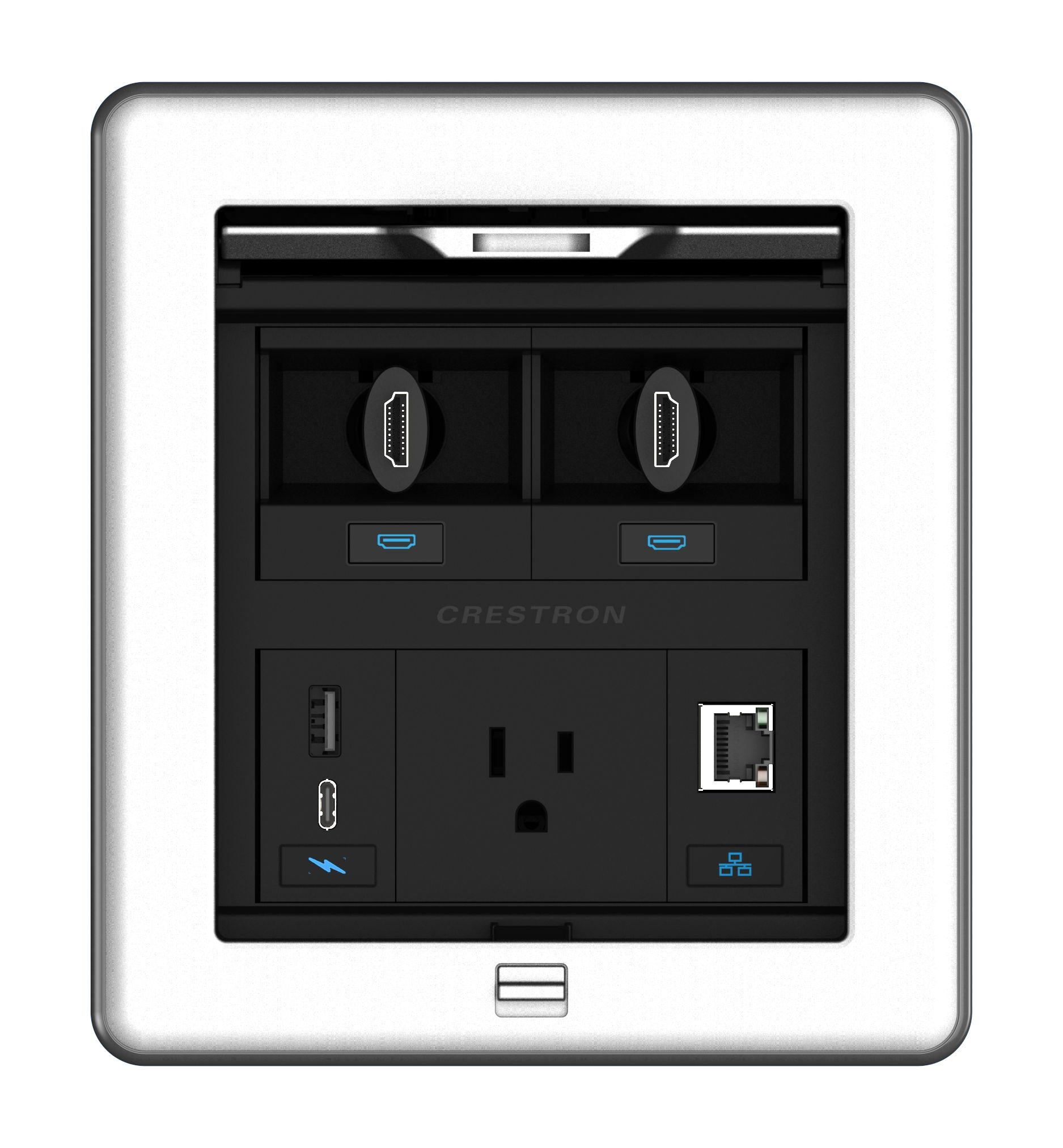 Das Crestron® FT2500ELECPTL FlipTop™-Kabelmanagementsystem wird in einen Tisch oder eine andere horizontale Fläche eingebaut und bietet modulare Anschlussmöglichkeiten. Es verfügt über einen versenkbaren Deckel, der vollständig im Gehäuse verschwindet. Bei eingeklapptem Deckel sind acht Modulschächte in zwei Reihen zu je vier angeordnet. Das flexible modulare Design lässt sich zudem mit einer Auswahl an Crestron-Zubehör individuell anpassen, und die Durchführungsabdeckung ermöglicht es, Kabel bei geschlossenem Deckel vollständig herauszuziehen.