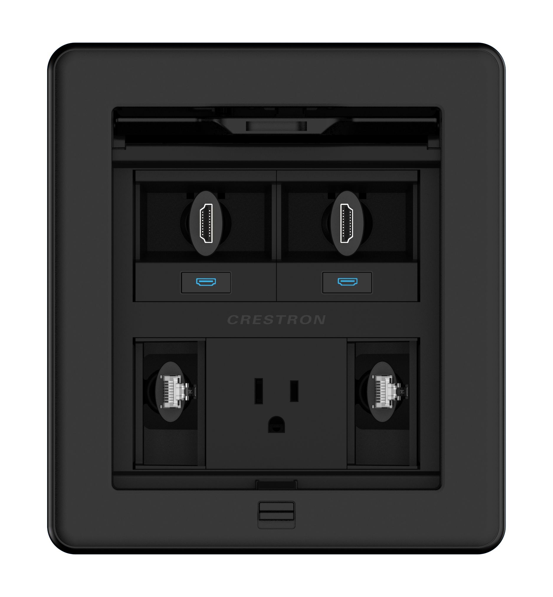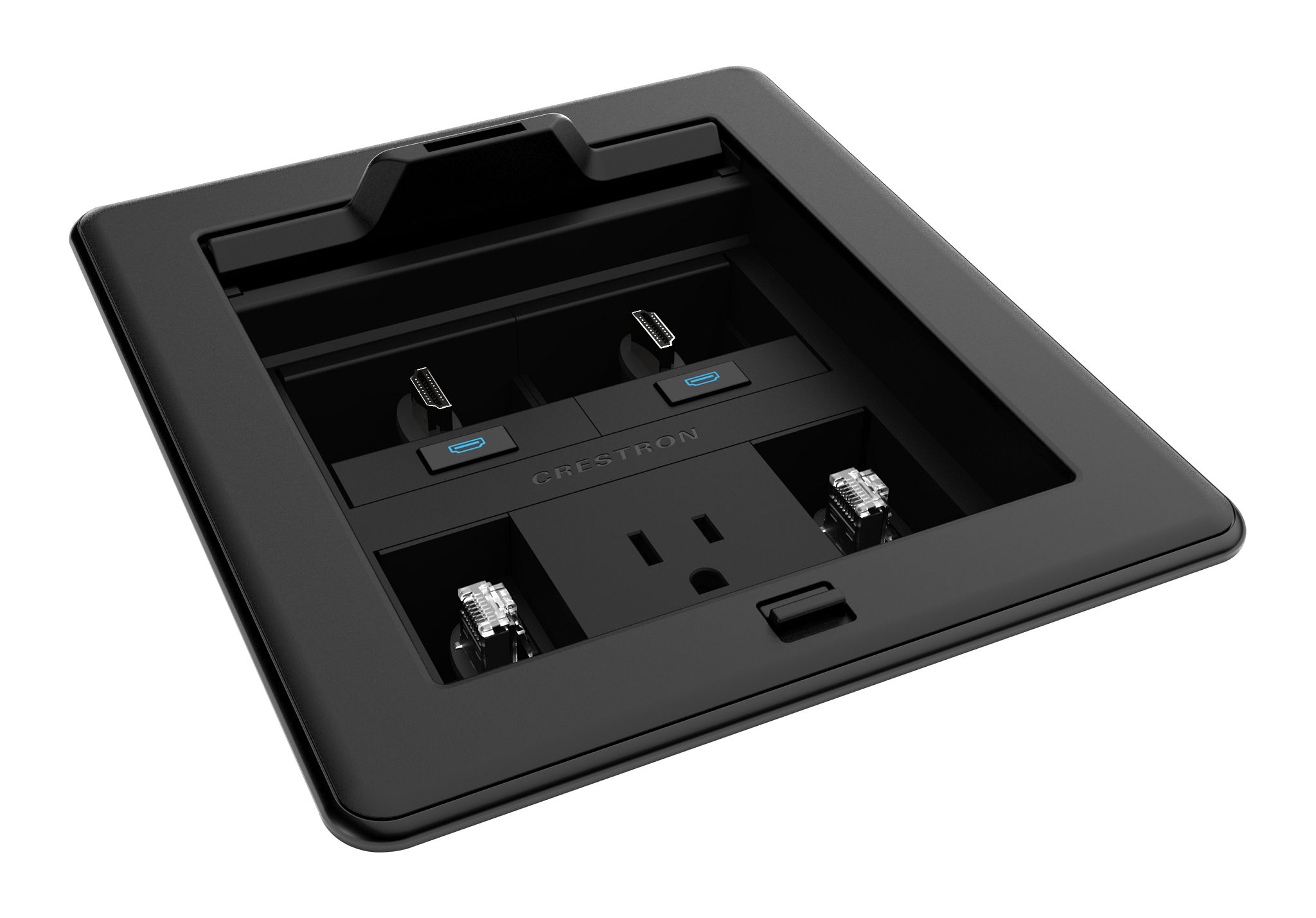 Das Crestron® FT2500ELECPTL FlipTop™-Kabelmanagementsystem wird in einen Tisch oder eine andere horizontale Fläche eingebaut und bietet modulare Anschlussmöglichkeiten. Es verfügt über einen versenkbaren Deckel, der vollständig im Gehäuse verschwindet. Bei eingeklapptem Deckel sind acht Modulschächte in zwei Reihen zu je vier angeordnet. Das flexible, modulare Design lässt sich zudem mit einer Vielzahl von Crestron-Zubehörteilen individuell anpassen, und die Durchführungsabdeckung ermöglicht es, Kabel bei geschlossenem Deckel vollständig herauszuführen.