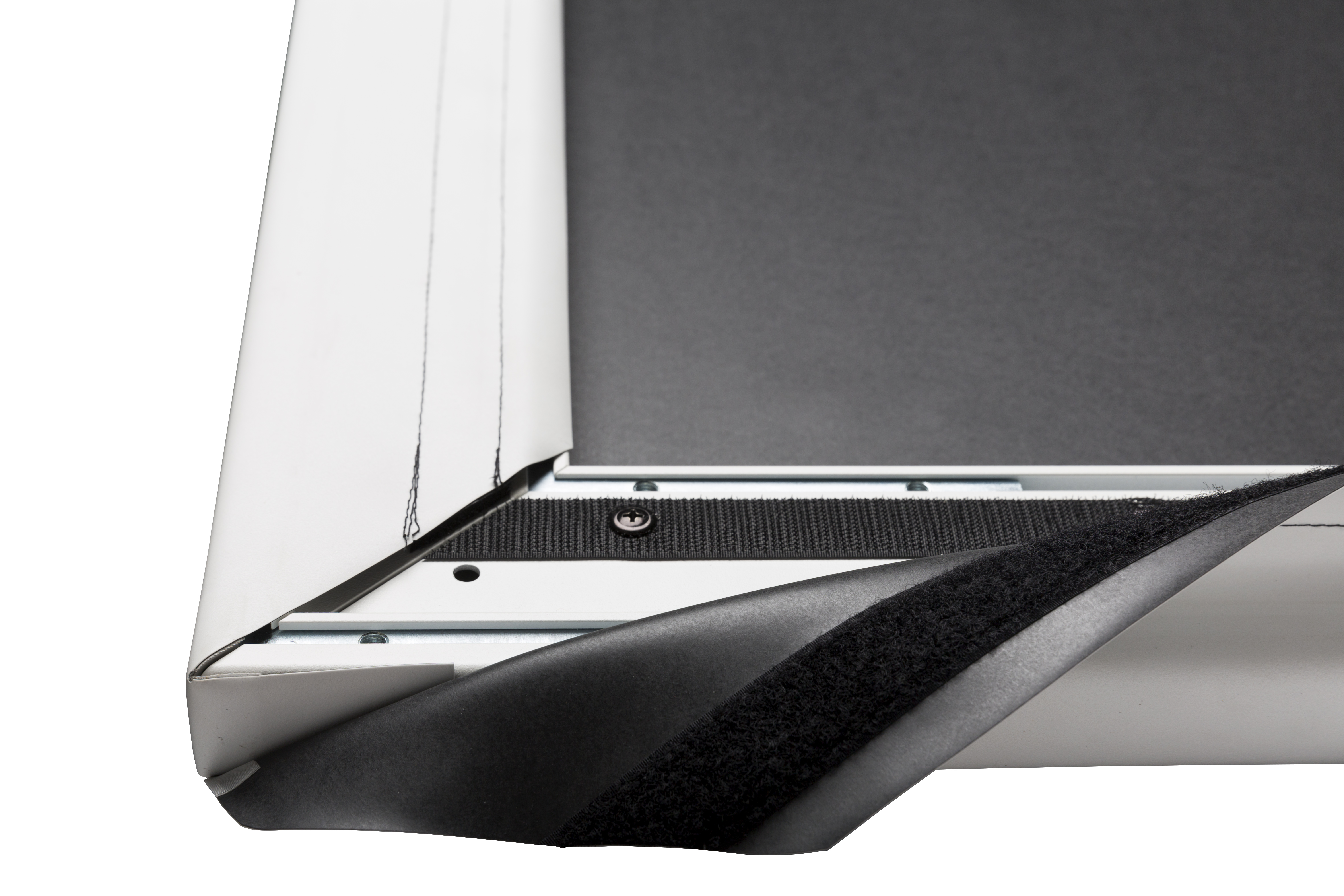 - Projektionstuch wird mit Velcro befestigt und wird um den Rahmen gespannt
