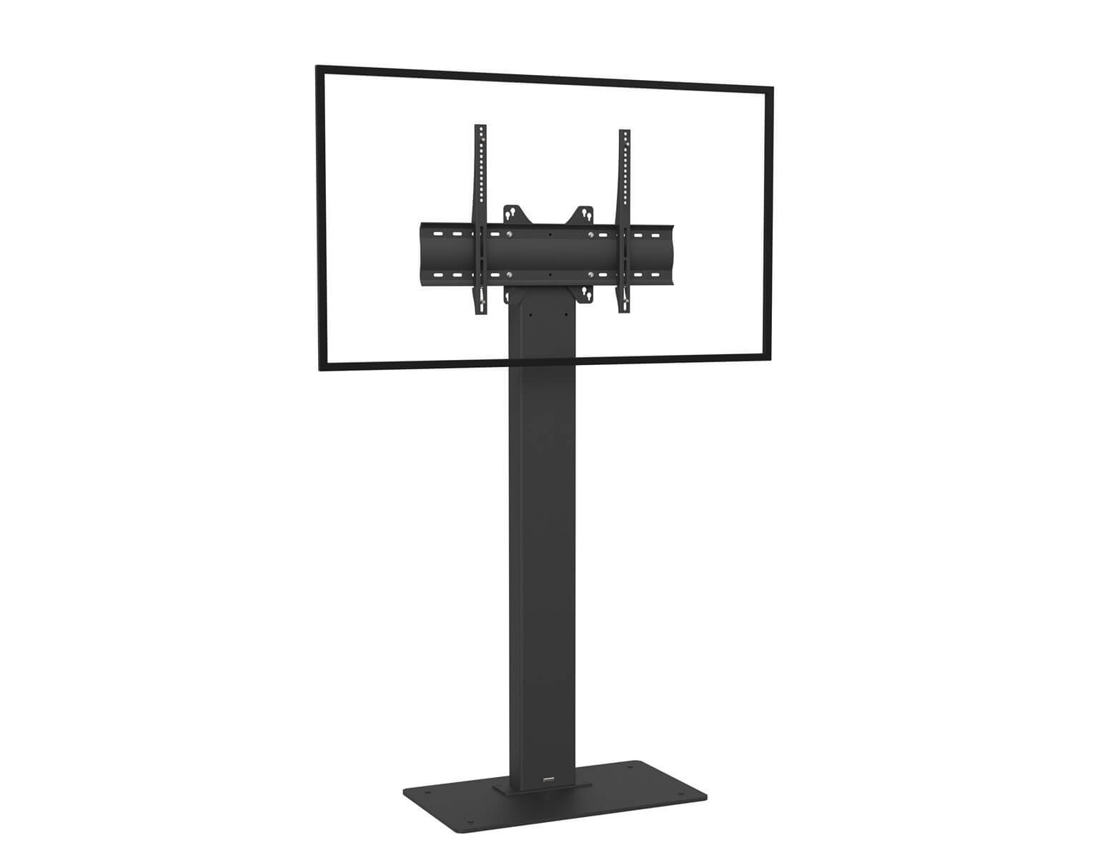 Sockel-Material: Schwarz lackierter Stahl auf Teflon-Pads Säulen-Material: Geschlossenes Rohr, schwarz lackierter Stahl VESA von 200 x 200 mm bis 600 x 400 mm Höhe von 1300 mm bis 1405 mm 55 kg max. Gewicht des Bildschirmes VERFÜGBARE OPTIONEN Spezifischer Codec-Halter (Tiefe: 55 mm) Basis auf Rollen Weiße Ausführung Geeignet mit Axeos-Halterungen für Kamera/Soundbar Axeos TYBOX Single Screen Stand for 40 to 65 displaysDer TYBOX Single Screen Stand von Axeos ist für Displays mit Bildschirmdiagonalen von 40 bis 65 Zoll und einem Gewicht von bis zu 55 kg ausgelegt. Er ist in zwei Ausführungen erhältlich: als Bodenständer mit einem Gewicht von 47 kg oder zur Bodenbefestigung mit einem geringeren Gewicht von 26 kg. Der Sockel aus schwarz lackiertem Stahl verleiht ihm eine edle Optik und steht dank Teflon-Pads sicher. Die formschöne Säule ermöglicht ein effektives Kabelmanagement und unterstreicht das ästhetische Erscheinungsbild des Ständers.