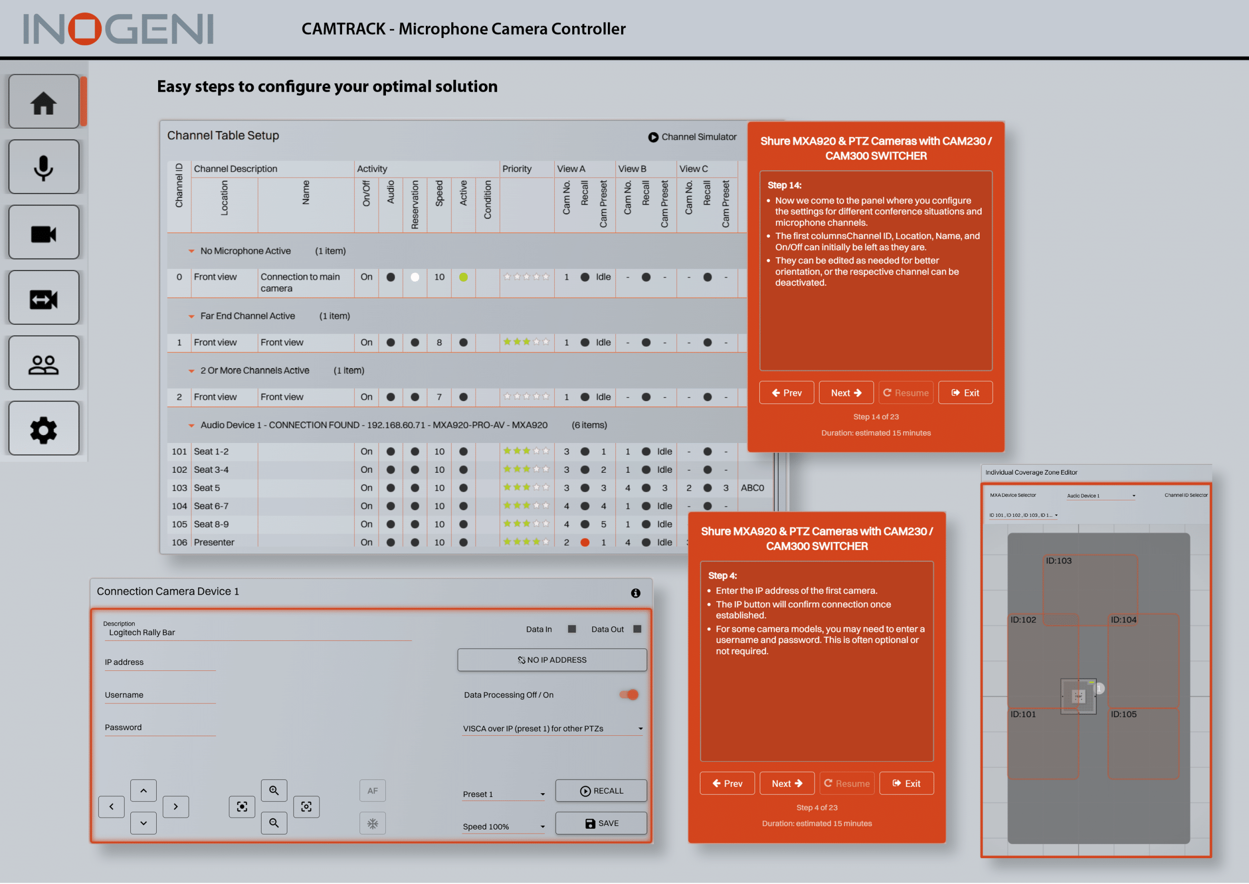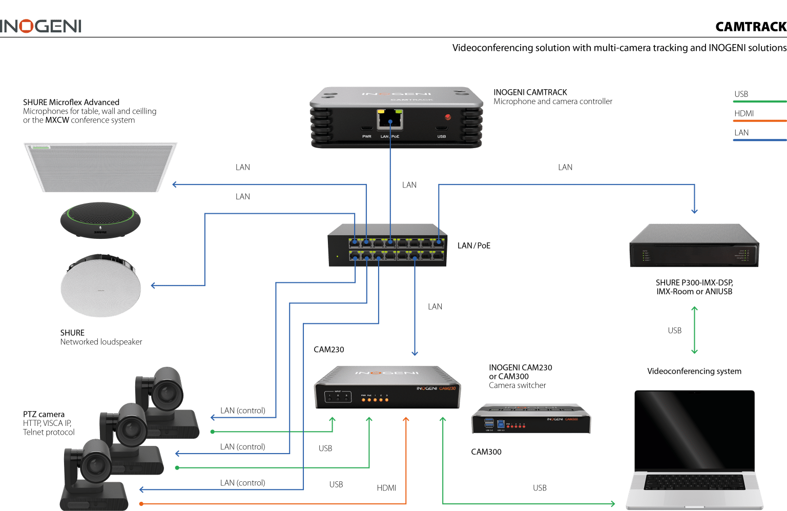 INOGENI CAMTRACK PRO lässt sich mit SHURE-Mikrofonen integrieren, um die Stimme des aktiven Sprechers zu erkennen und PTZ-Kamera-Voreinstellungen sowie KI-Tracking (sofern unterstützt) auszulösen. Anschließend kommuniziert es mit einem INOGENI-Umschalter, um den entsprechenden Videofeed nahtlos in das Konferenzsystem zu leiten. Das System bietet automatisierte Kamerasteuerung und Videoumschaltung für Konferenzräume, Hybrid-Meetings und Live-Veranstaltungen.