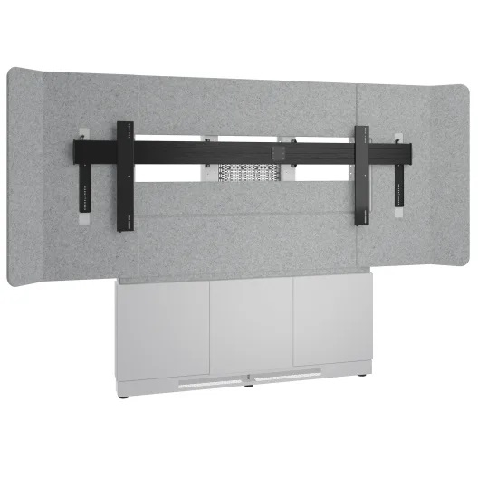 Das Forum 105 Floor-to-Wall von MAP ist eine Displayhalterung, die an einer Wand befestigt wird und am Boden aufliegt. Die Halterung ist für 105-große Displays im Ultra Wide-Format (21:9) konzipiert und eignet sich ideal für interaktive Meetings. Der Filz hinter einem Display sorgt für eine echofreie Akustik. Hinter den Schranktüren unterhalb der Displayhalterung können verschiedene Dinge wie Peripheriegeräte gelagert werden.