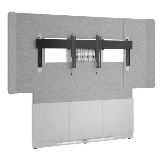 Das Forum 80 - 85 Floor-to-Wall von MAP ist eine Displayhalterung, die an einer Wand befestigt wird und am Boden aufliegt. Die Halterung ist für 80 - 85-große Displays im Ultra Wide-Format (21:9) konzipiert und eignet sich ideal für interaktive Meetings. Der Filz hinter einem Display sorgt für eine echofreie Akustik. Hinter den Schranktüren unterhalb der Displayhalterung können verschiedene Dinge wie Peripheriegeräte gelagert werden.