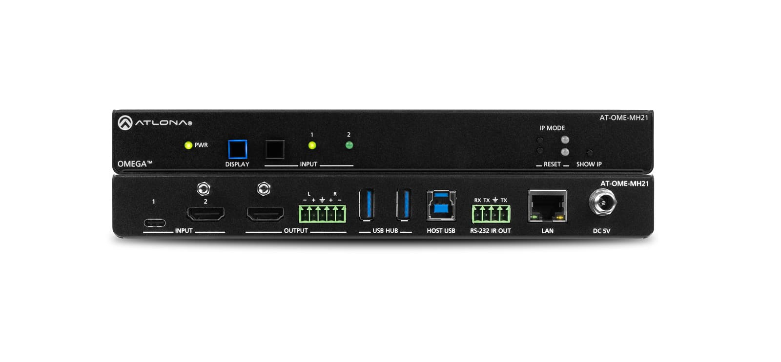 1x HDMI 2.0 Eingang 1x USB-C Eingang (AV und Daten) 1x USB 3.0 Hub Auto-switching Audio de-embedding (symmetrisch) UHD/4K downscaling Inklusive Netzteil (5V, 2.6A) Inklusive 2m USB-C Kabel Herstellergarantie: 3 Jahre Atlona AT-OME-MH21 Switcher, USB-C X HDMIDer Atlona AT-OME-MH21 ist ein kompakter, vielseitiger Switcher mit HDMI- und USB-C-Eingängen. Er ist ideal für Huddle Rooms und kleine Besprechungsräume. Der OME-MH21 verfügt über automatische Eingangsumschaltung, Display-Steuerung, Audio-De-Embedding und einen USB 3.0-Hub für Videokonferenz-Peripheriegeräte oder Touch-Displays. Der OME-MH21 ist HDCP 2.2-kompatibel und unterstützt 4K HDR und 4K/60 4:4:4 bei HDMI-Datenraten von bis zu 18 Gbps. Zusätzlich können UHD/4K Signale auf 1080p runterskaliert werden.