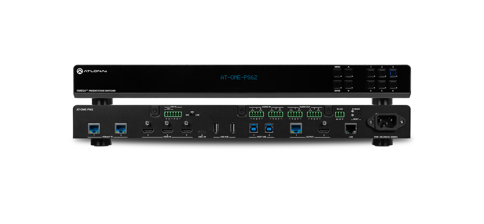 HDMI 1.4/2.0 Kompatibel 2x HDBaseT Eingang (max. 100m, PoE) 3x HDMI, 1x USB-C Eingang 2x USB 3.0 Host lokal USB 2.0 über HDBaseT (max. 120 Mbit/s) 1x HDBaseT HDMI Matrix Ausgang Audio-Routing und (de)-embedding USB-C unterstützt Audio/Video, Daten und Ladefunktion Herstellergarantie: 3 Jahre Atlona AT-OME-PS62 Multiformat Switcher / ScalerDer Atlona Omega AT-OME-PS62 ist ein Multiformat-Präsentationsumschalter mit Matrixfunktionalität. Ein Mix aus HDBaseT-, HDMI-, USB-C Eingängen ermöglicht sowohl den Anschluss von Rednerpulten und Konferenztischen wie auch die Integration lokaler Quellen im Technikschrank. Das besondere an der Omega-Serie von Atlona ist die Integration von USB Host und USB Hub Anschlüssen. USB 3.0 Geräte lassen sich direkt lokal anschließen und schalten, USB 2.0 Signale (maximal 120 Mbit/s) können auch über die HDBaseT Schnittstellen übertragen werden. Passende HDBaseT Geräte mit USB Übertragung sind: AT-OME-EX-TX, AT-OME-EX-RX, AT-OME-SR21, AT-OME-RX21, AT-OME-RX11 Die HDBaseT Ein- und Ausgänge sind PoE fähig und können Video, Audio, RS-232, IR, USB und Ethernet über eine Distanz von bis zu 100m übertragen. Die Multiformat-Matrix unterstützt alle Video- und Audioformate des HDMI 1.4/2.0 Standards (über HDBaseT maximal UHD@60Hz 4:2:0) und bietet umfangreiche Audio Routing- und (de)-embedding-Funktionen. Am HDMI Ausgang ist Up/Downscaling möglich. Dieses Gerät ist nicht mit dem HDVS-300 kompatibel