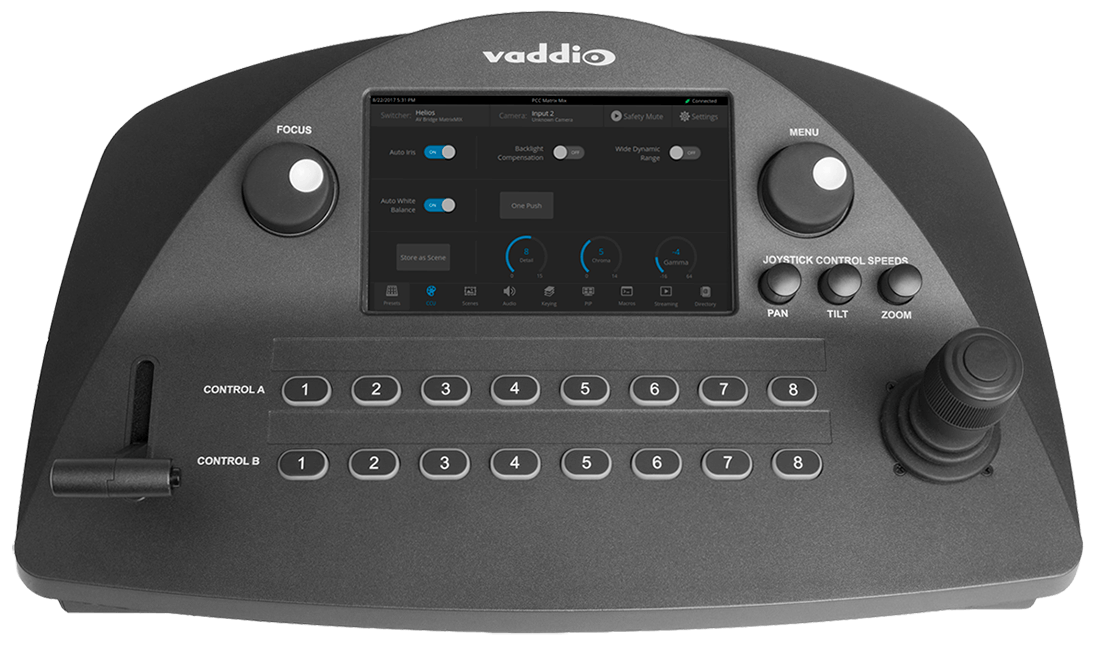 Das Vaddio AV Bridge MatrixMIX Production System beinhaltet die AV-Bridge MatrixMIX sowie den PCC MatrixMIX Kameracontroller. Bei der AV-Bridge MatrixMIX handelt es sich um einen 8x2 Videomischer, der auch Multiviewer-Ausgänge bereitstellt und sowohl analoge als auch HDMI-, USB- und IP-Audiokanäle unterstützt (11x7 Audio-Mixer). Der PCC MatrixMIX Kameracontroller bietet Kamerasteuerung, Signalschaltung und Grafikeinblendungen. In Kombination mit den Vaddio-PTZ-Kameras ergeben sich zahlreiche Einsatzmöglichkeiten in größeren Hörsälen oder bei anderen Live-Produktions-Anwendungen.