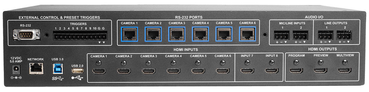 - AV Bridge: 8x2 Videomischer, 11x7 Audiomischer, Multiviewer-Ausgänge
