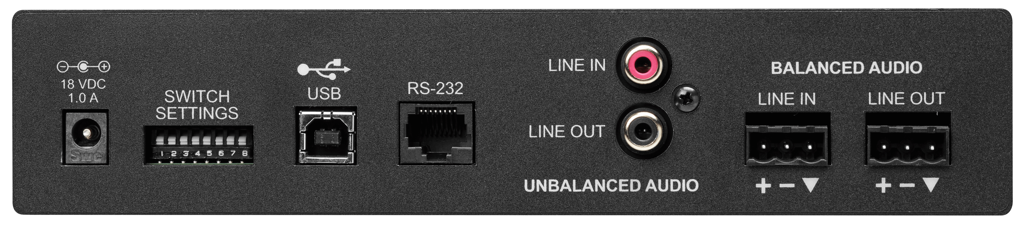 - Unbalanced Line-Ein- und Ausgänge (Mono Consumer Level Eingang (-10dB) auf RCA und Mono-Consumer-Pegelausgang auf RCA)